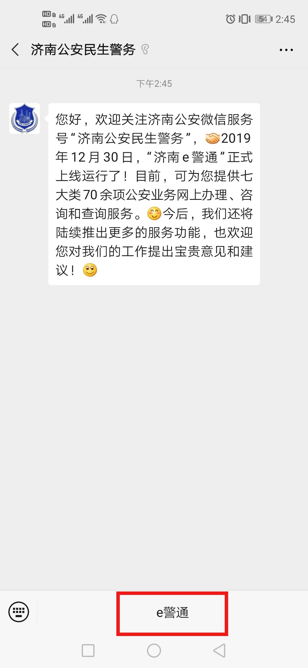 第二步:在“济南公安民生警务”微信服务号或“济南公安”订阅号主界面的下方找到菜单“e 警通”,点击即可进入“济南e警通”首页面。