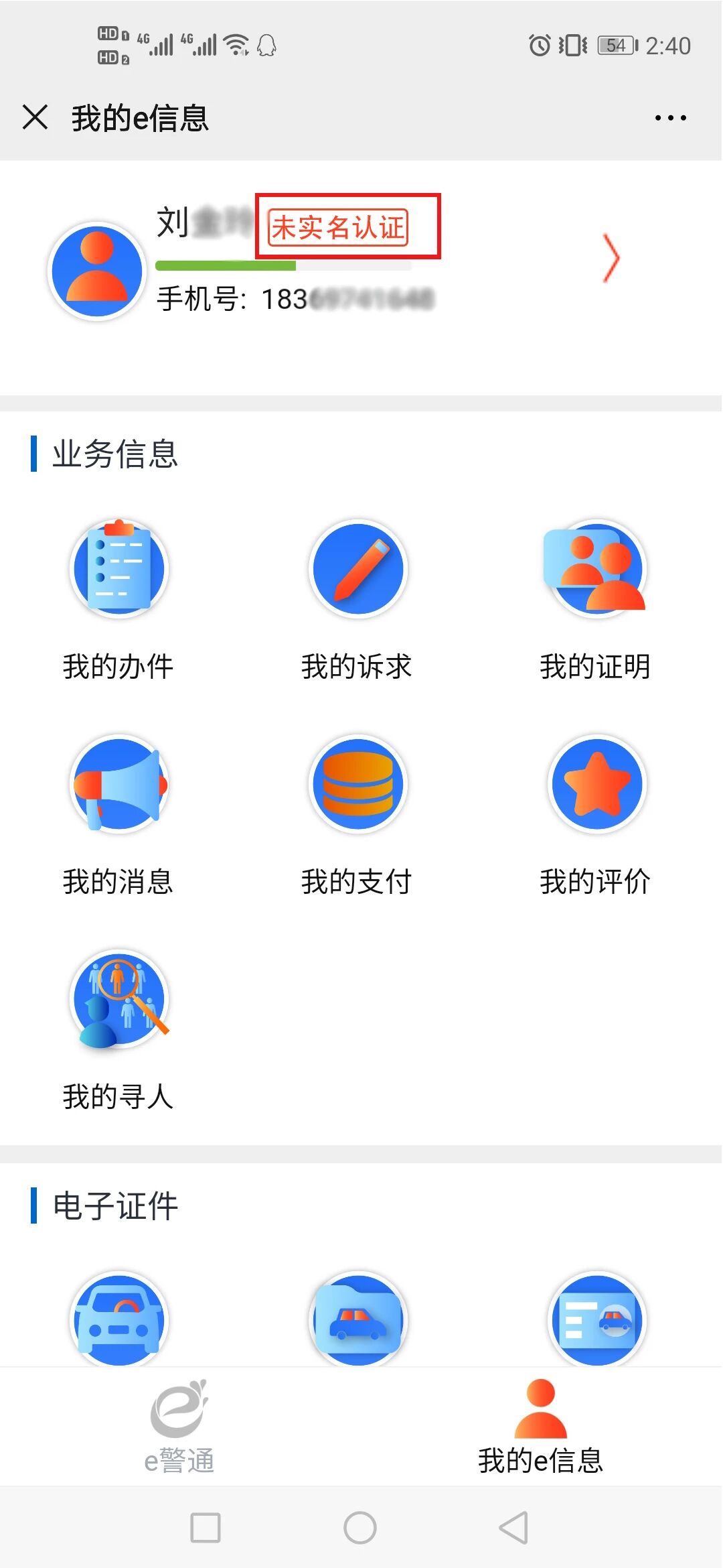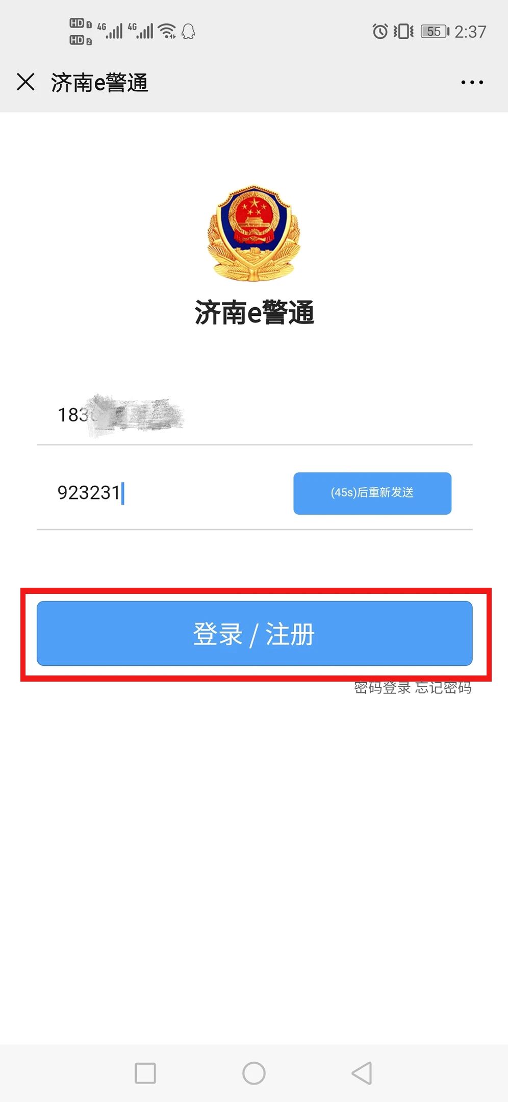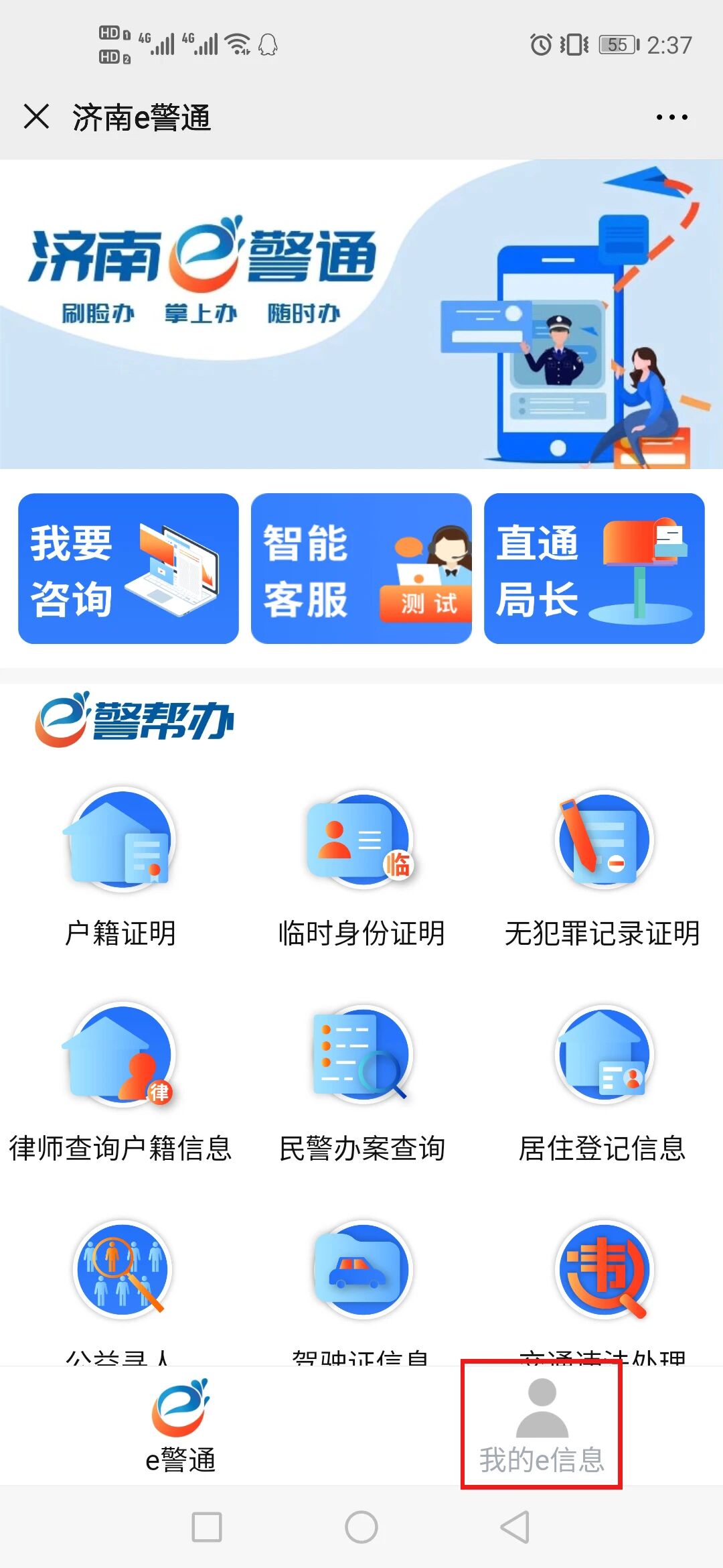 第三步:在“济南 e 警通”首页面下方找到“我的e信息”菜单,点击进入登录/注册界面,输入手机号,输入获取的短信验证码点击登录/注册即可登录,如果需要设置密码可在“登录/注册”界面点击“忘记密码”或者登录成功后“完善资料”界面点击“修改密码”根据提示完成即可。