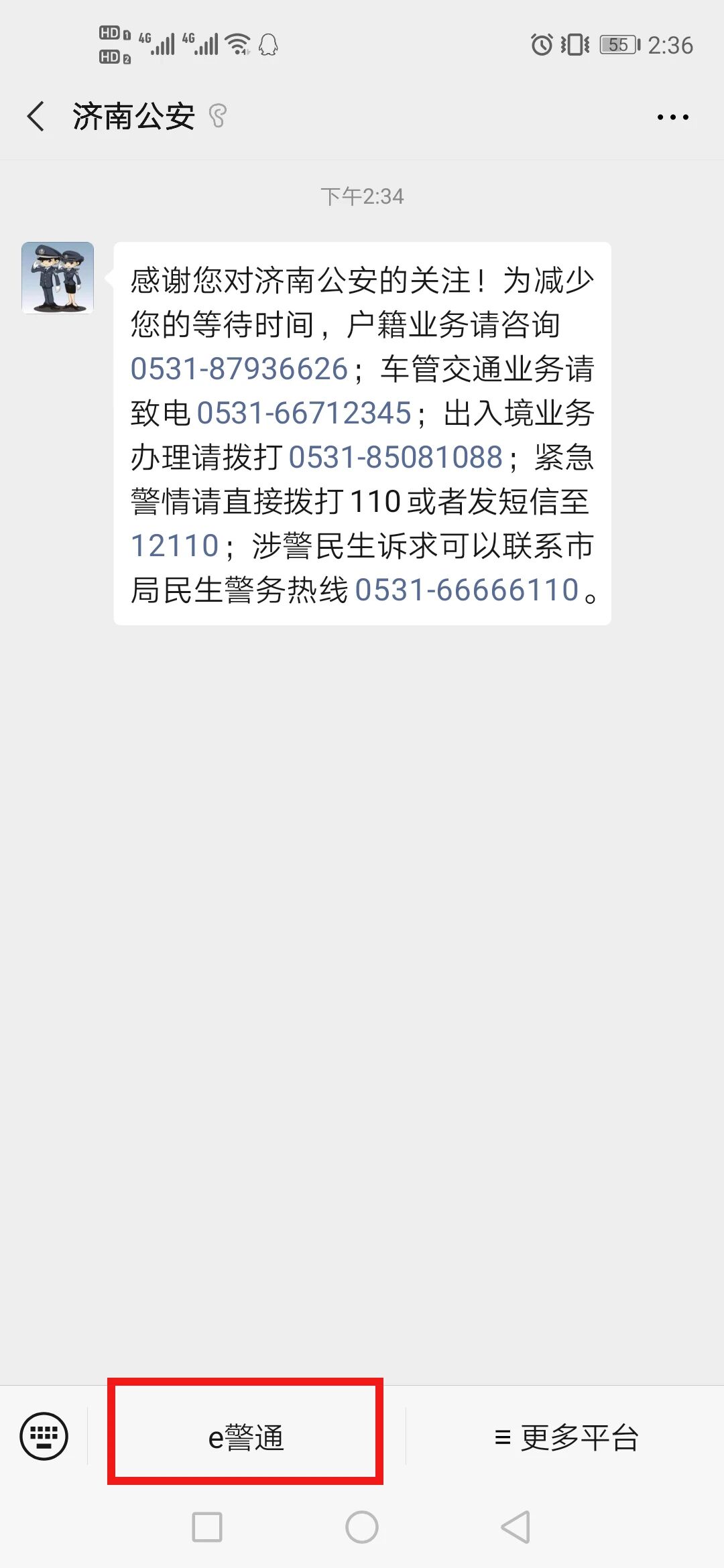 第一步:首先用手机打开微信,扫描二维码或点击搜索,输入“济南公安民生警务”或“济南公安”,进行搜索,找到“济南公安民生警务”微信服务号或“济南公安”订阅号,进行关注,然后进入公众号。